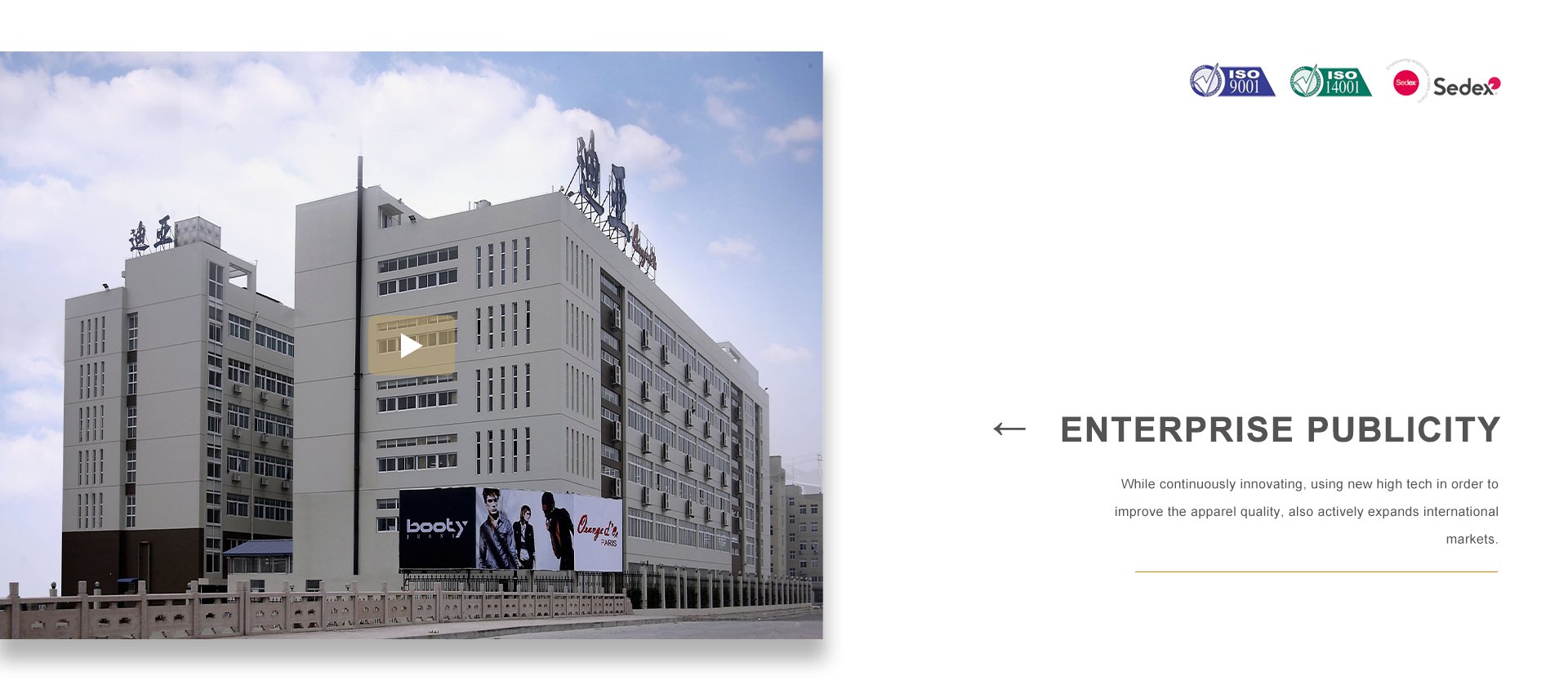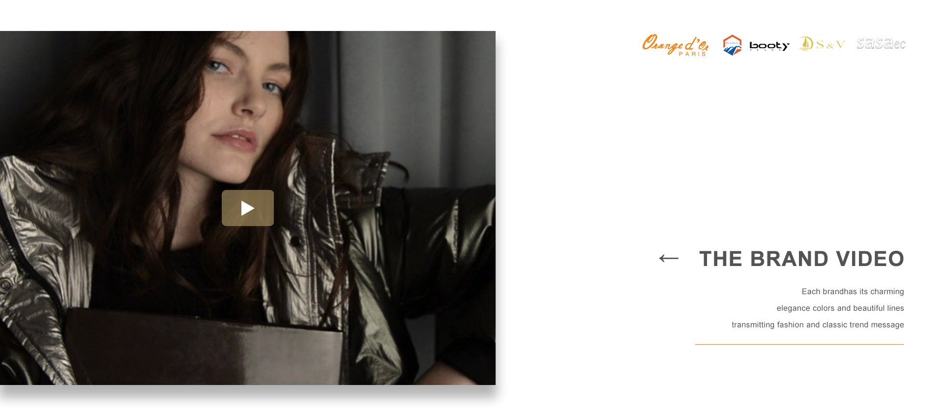 品牌建設(shè)是公司堅(jiān)持不懈的追求,我們每年都會(huì)積極參加國(guó)內(nèi)外舉辦的各大服裝展銷會(huì)。憑借著良好的質(zhì)量與信譽(yù),市場(chǎng)占有率在逐漸擴(kuò)大,產(chǎn)品遠(yuǎn)銷歐洲、美洲、亞洲等國(guó)。公司以生產(chǎn)棉衣、羽絨服、派克、大衣、夾克、運(yùn)動(dòng)休閑服飾等為主,旗下主打品牌有 ORANGE D’OR 、CLAIRVAL、BOOTY JEANS 、S&V和SASAEC,各品牌服飾均以典雅的色彩、優(yōu)美的線條、卓越的魅力吸引著都市麗人,將時(shí)尚、經(jīng)典的潮流信息予以淋漓盡致的演繹。